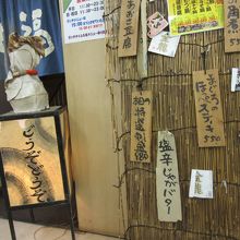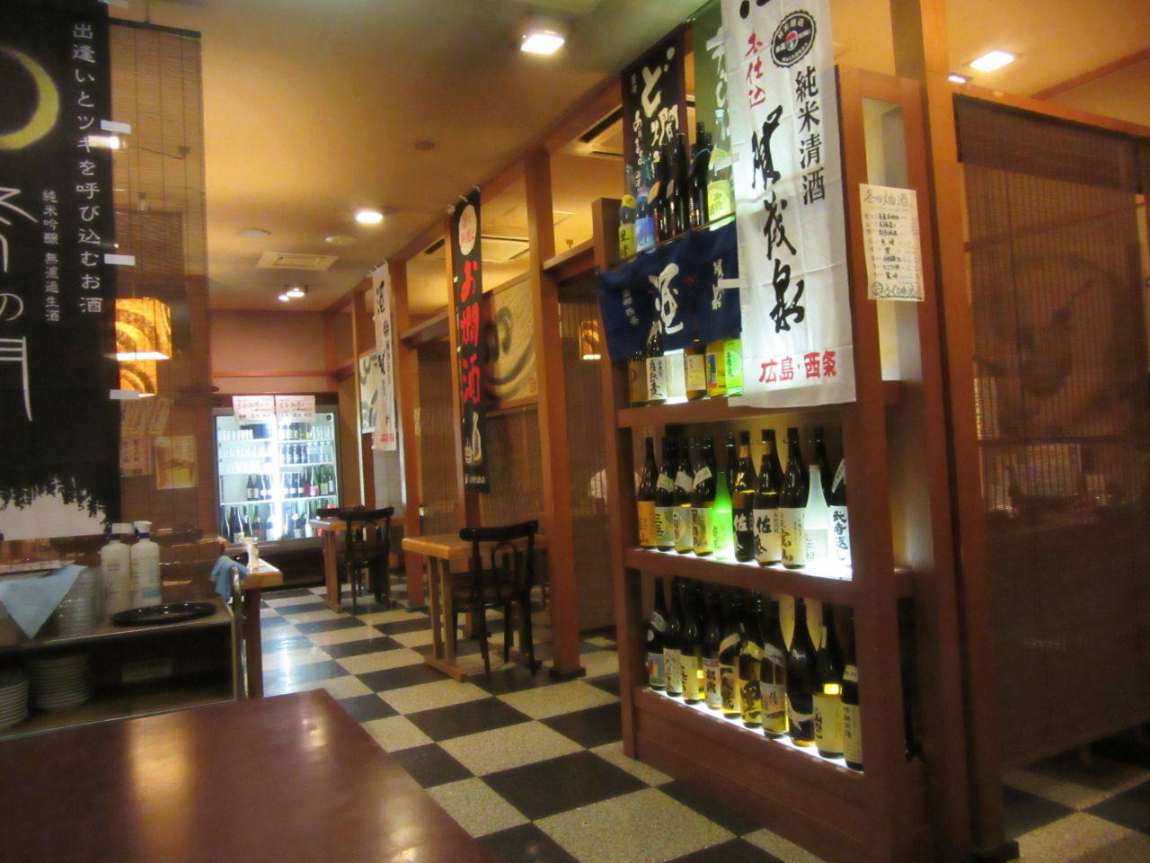 本来、夜のお店でしょう。日本酒、焼酎の見本が飾られています。店内は日本酒に合うインテリア(墨絵や暖簾等)。でも昼のBGMはジャズが流れていました。
