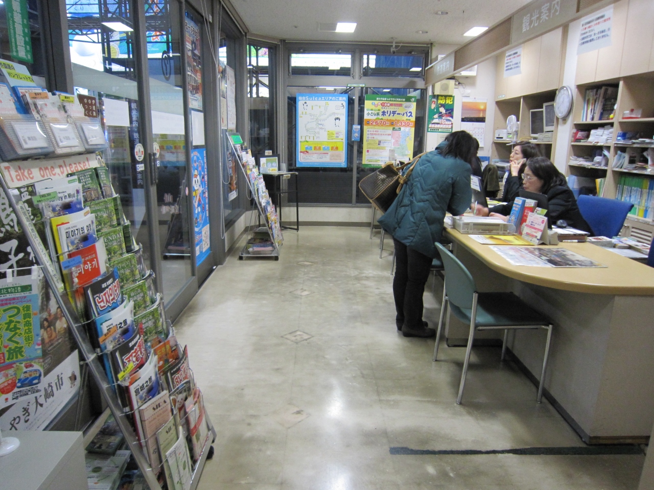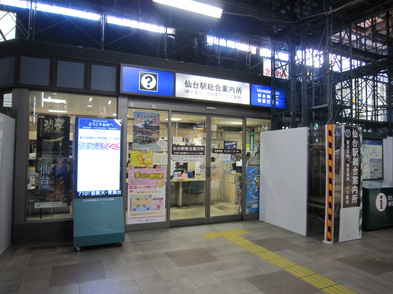 仙台駅2階在来線改札口を出て突き当り左側です。案内する人は3人いて観光客が多いためひっきりなしに聞きに来るようで常時忙しいようです。丁寧に教えてくれます。案内パンフレットも自由に取れ外国語のパンフレットもありました。一度利用すると良いと思います。