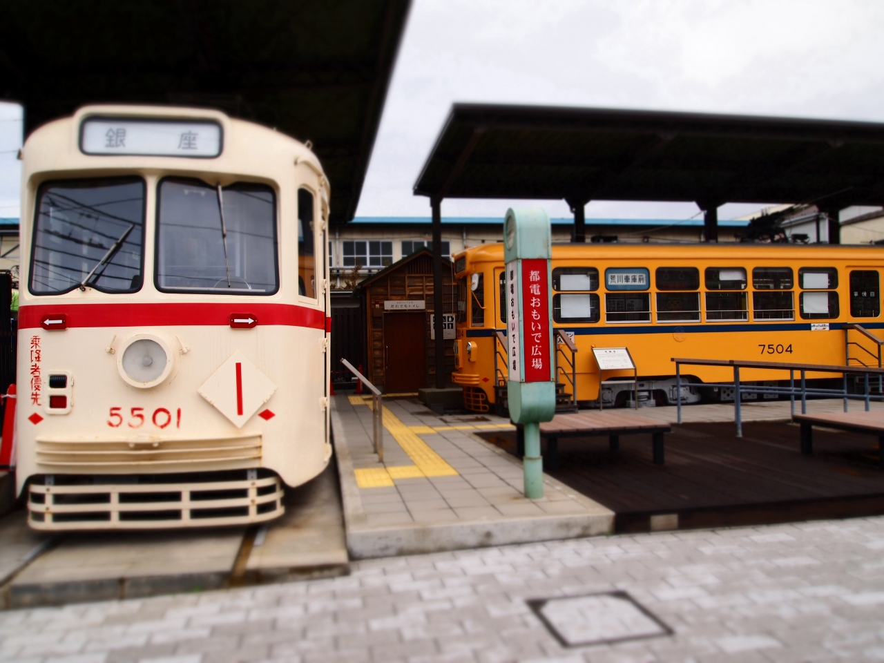 荒川車庫前駅すぐそば。往年を偲ばせるレトロな停留所風の敷地内に、かつて都電荒川線を走っていた車両2両が静かに展示されています。