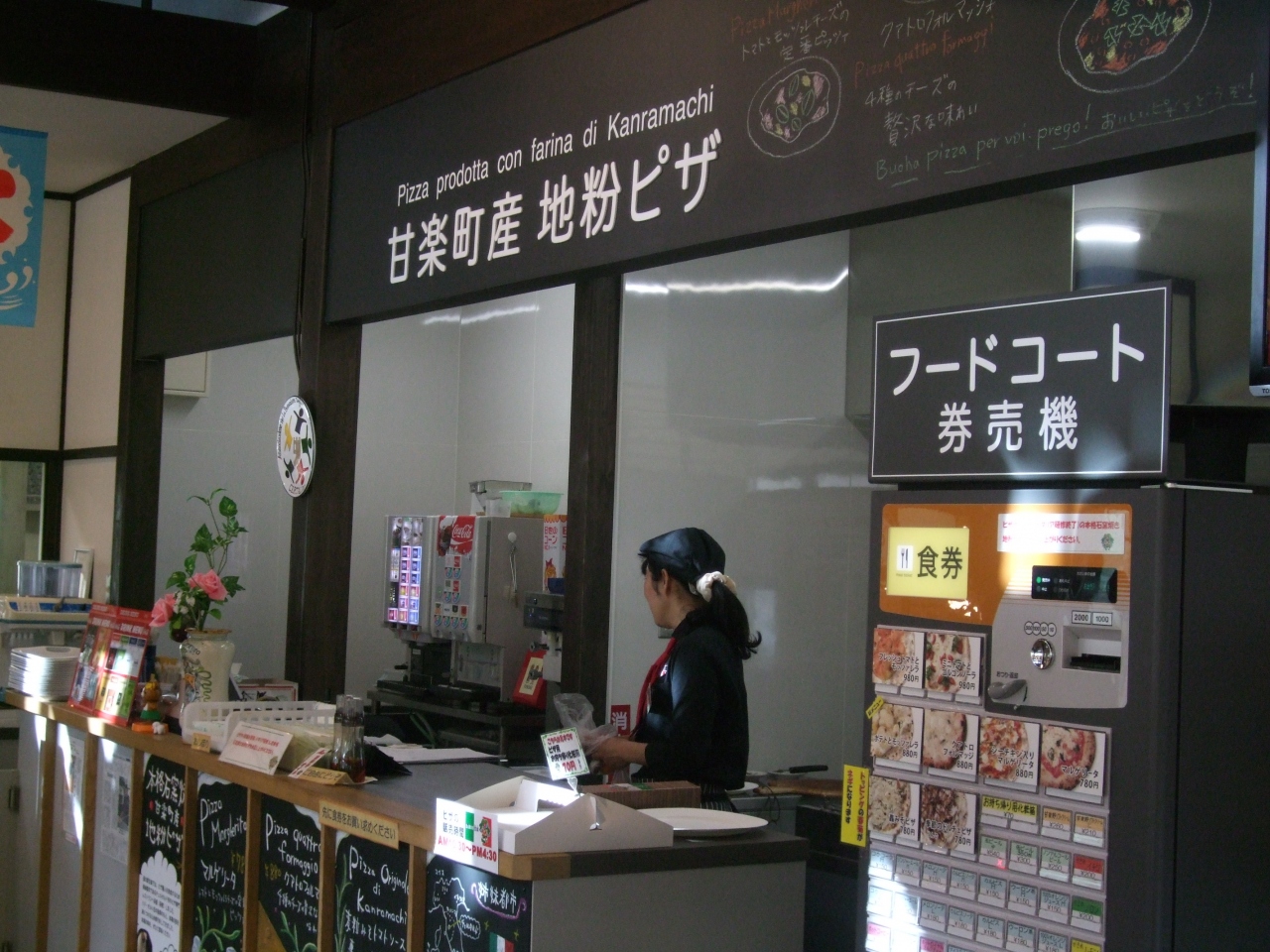 フードコートの「甘楽町産地粉ピザ」が絶品です。本格的ピザ窯で焼き立てのピザ『マルゲリータ』(780円)が定番です。ピザ生地とモッツァレラチーズが美味しいです。
