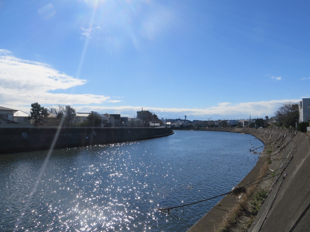 境川沿いの道はよく整備されていて、江ノ島までのウォーキングに最適です。大勢の人が、グループで列をなして歩いている風景も良く見かけます。鵠沼のあたりからは江ノ島が見えてきて、海に近づいてきたことを実感できます。