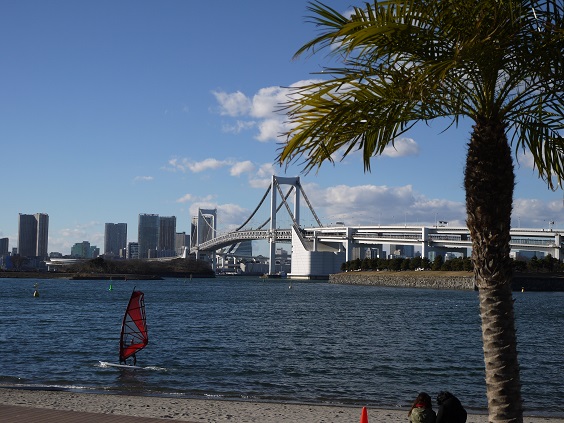 天気が良いので久しぶりにお台場を訪れましたが東京の中心部とは思えない風景です。手前のヤシの木とレインボウーブリッジが良く似合う、この時期風が有ると少々寒いですが、防寒対策を取ってのんびり浜辺の散歩も良いものです。