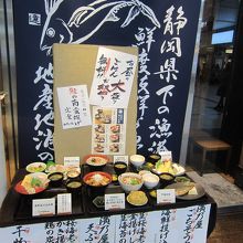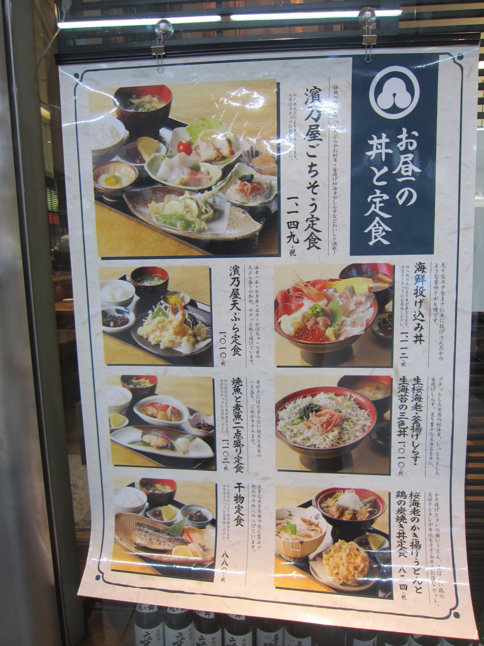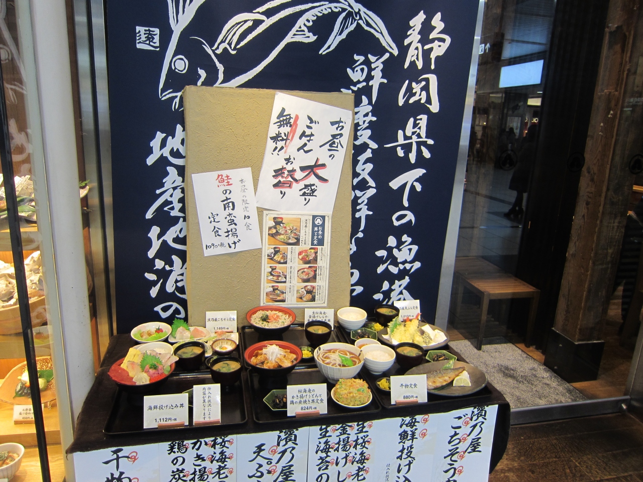JR浜松駅中央の在来線改札口正面、駅構内です。地元の舞阪漁港や浜名湖で上がった取れたてで鮮度抜群な魚介類を直接買い付け、お店へ直送。駅構内でありながら天井が高く、ゆとりある開放感のある造りとこだわりを感じさせる内装のお店で、港の雰囲気を感じさせ、活気が溢れています。ランチメニューの定食や丼はどれもお得感があります。濱乃屋ごちそう定食と濱乃屋天ぷら定食を食べましたがどちらも満足できる味とボリュームでした。