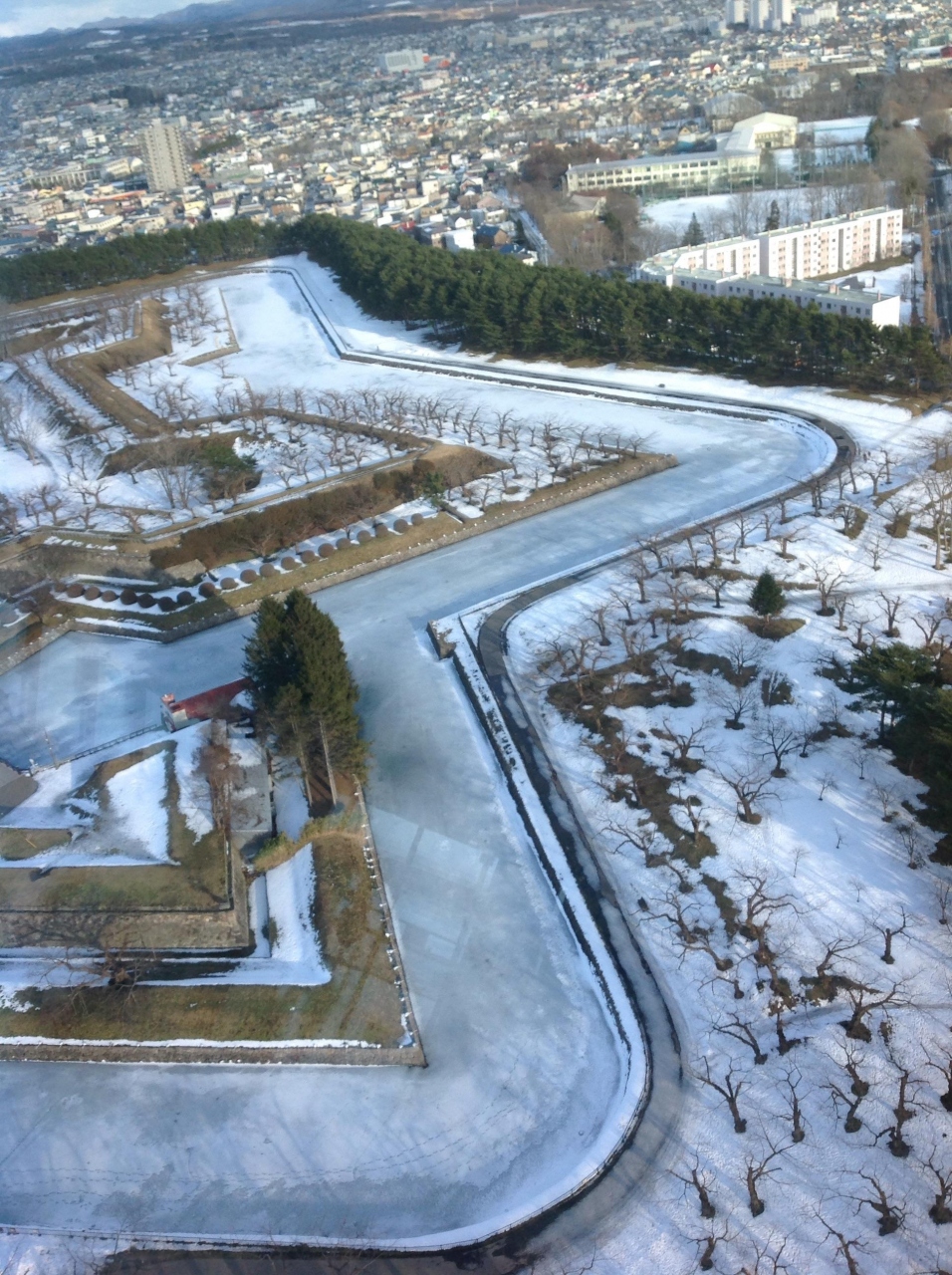 ここはタイトルにも書いた通り、側の五稜郭タワーに登らないと形状を実感出来ません。今回は積雪で全景をつぶさに確認できませんでしたが、タワーの展望台にはレプリカが展示されているので、それと見比べるとよくわかります。五稜郭のような城郭は国内では他にないと思っていましたが、それが誤りだった事もタワーに行くと分かります。