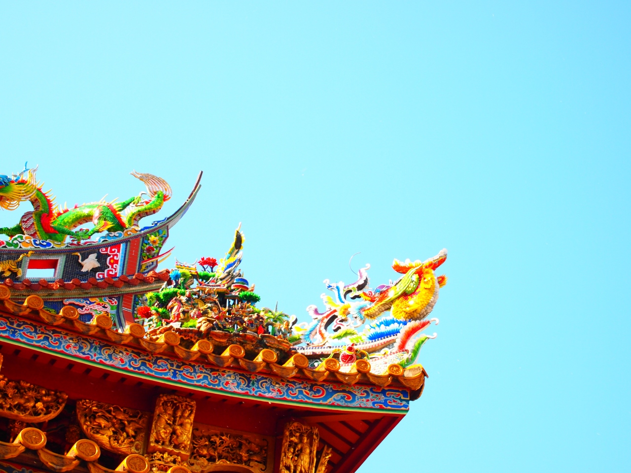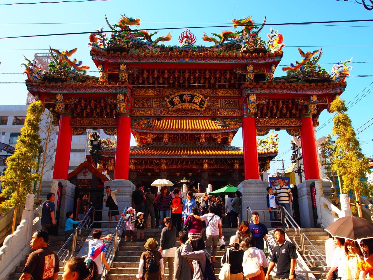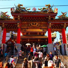 横浜中華街にそびえる関帝廟。建物のみならず、門の装飾と色彩に圧倒されます。