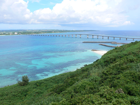 眼下にひろがるエレラルドブルーの海、海の上をまっすぐに走る来間大橋の超絶景を見れるポイント!