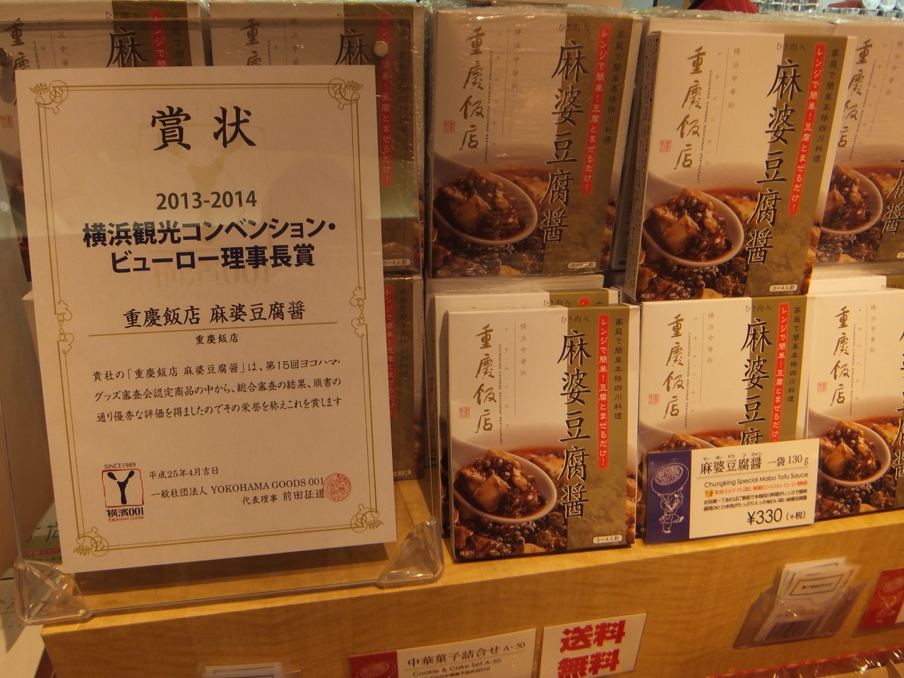 いつもクッキーやお茶を買っていますが、今回は麻婆豆腐のレトルトパックを買ってみました。お店の品揃えは重慶飯店のオリジナルブランドが充実。以前はあったクッキーの詰め合わせがなくなっていたり、その時々によって変わっていきます。