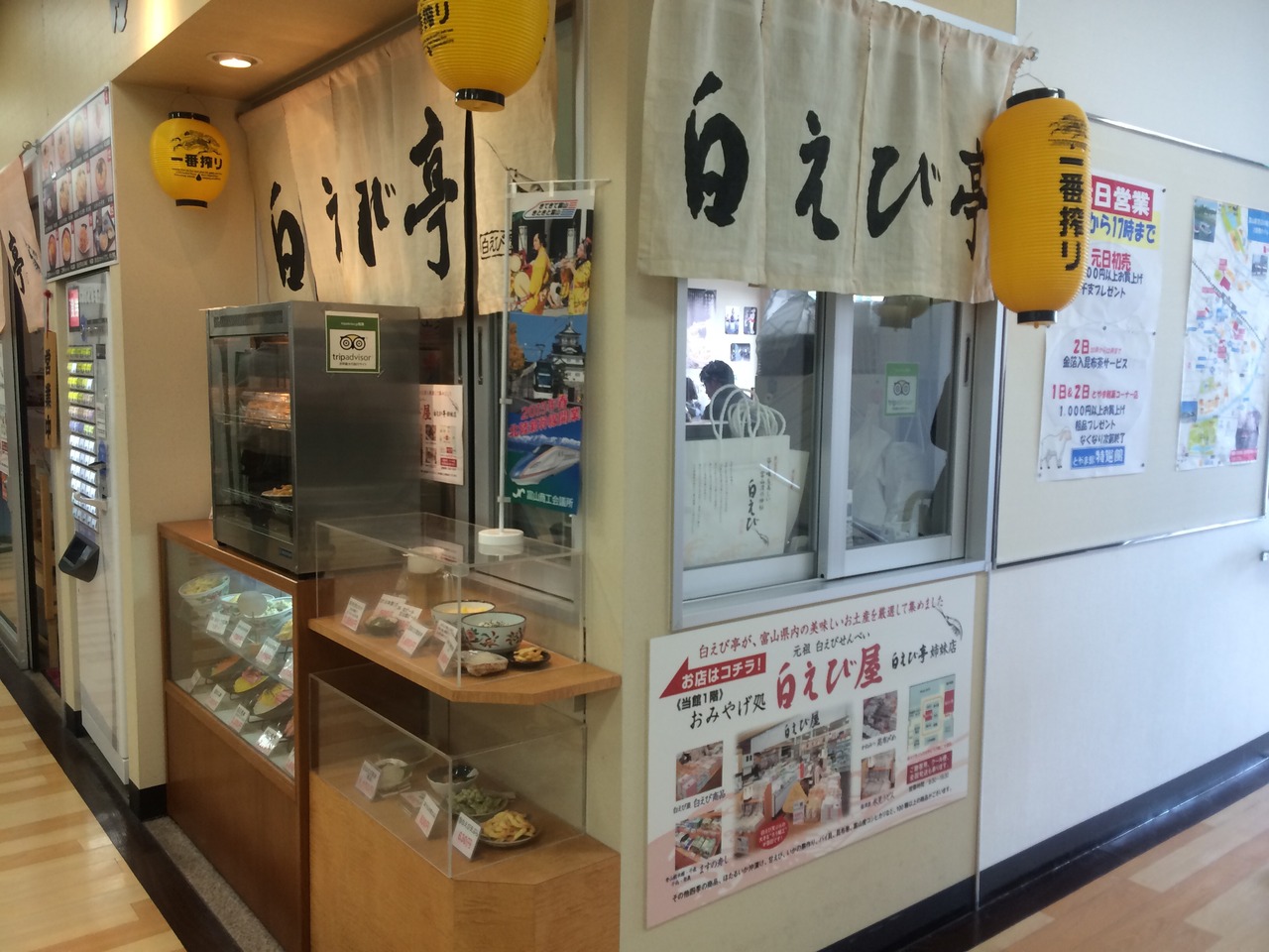 富山駅をでてすぐ左にある銘品館の中にありますが、3月の新幹線開業後は移転すると思うのでお気をつけください。富山名物の白えびは、甘エビより小さいですが、甘エビより甘くて殻が柔らかくて美味しいです。時間の関係でテイクアウトのどんぶりを食べましたが、美味しかったのですが、揚げたてをいただけばよかったと思いました。