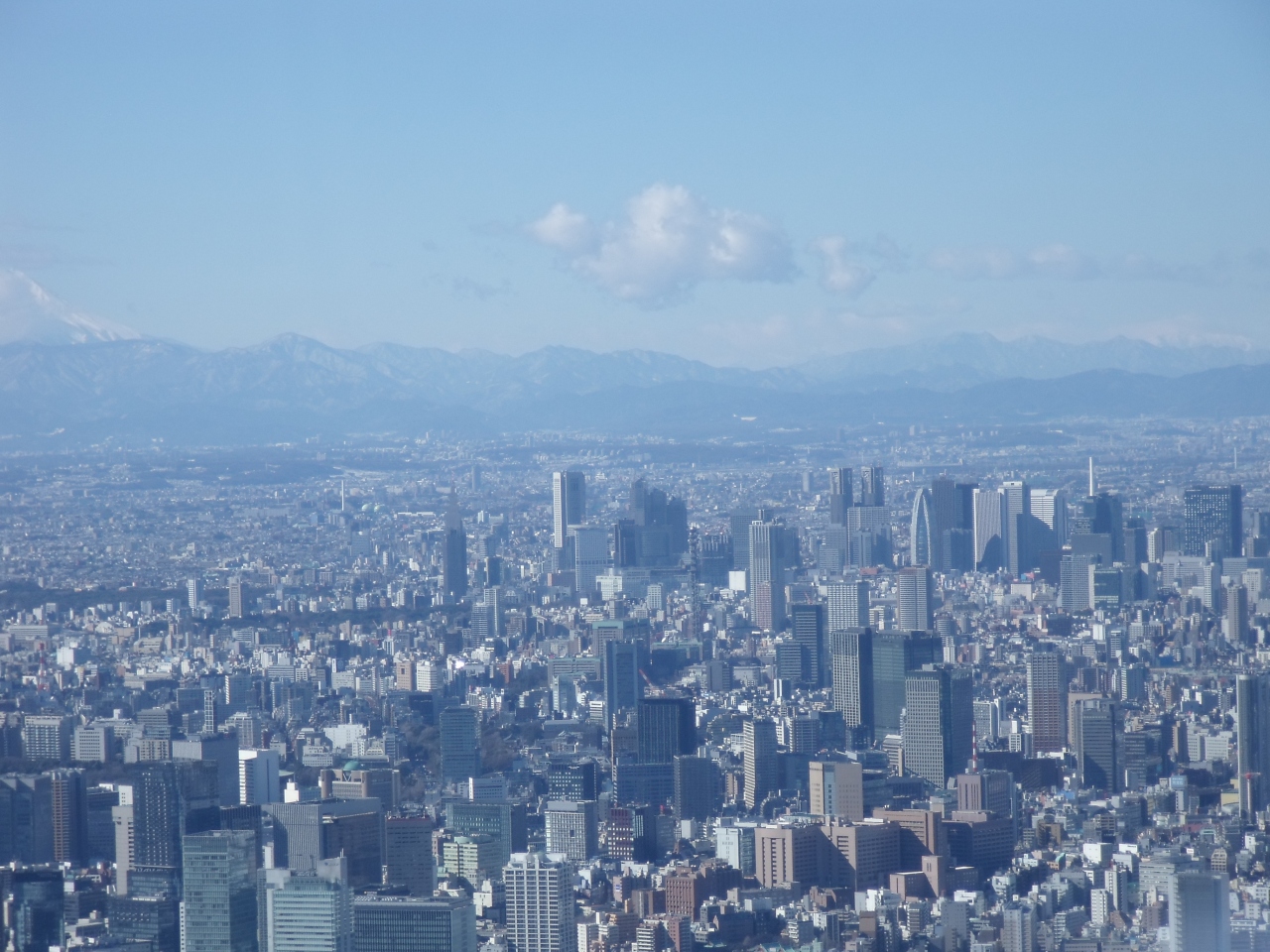 絶景です。前日が雪と雨だったせいか、風がやや強かったせいか、都庁や六本木ヒルズの展望室の時よりもきれいに見えます。更には足元も。高所恐怖症の方にはお勧めできませんが、おもちゃのような街と車がほぼ真下に見えます。
