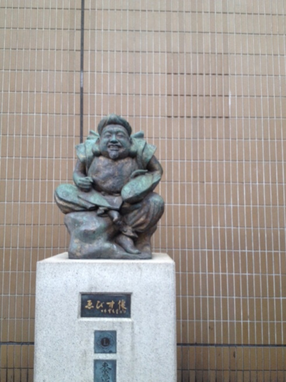 恵比寿駅西口から改札をでて左手に向かって出て行き、アトレの巨大なエスカレーターの脇から外に出ると、壁沿いにこの像があります。ライオンズクラブ寄贈らしい。何故か足もとには賽銭箱も設置されています…