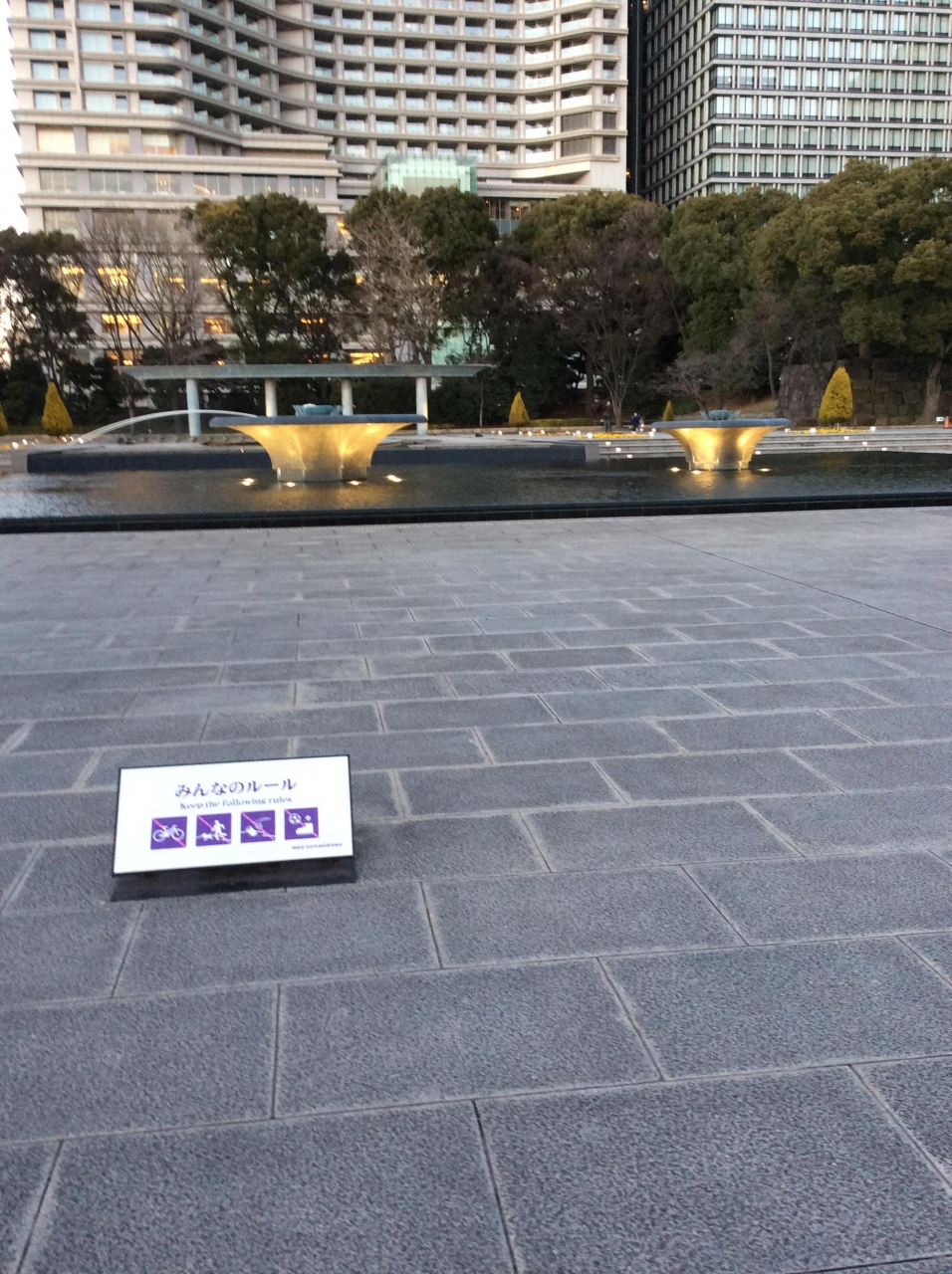 内堀通り沿いにあります。パレスホテルの和田倉豪を挟んでとなりです。春先などではここで休憩したり、3つある噴水から水が勢いよく放出される様子を見ようと見物客も結構集まいるのですが、さすがにこれだけ寒いと人っ子一人いませんでした。