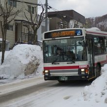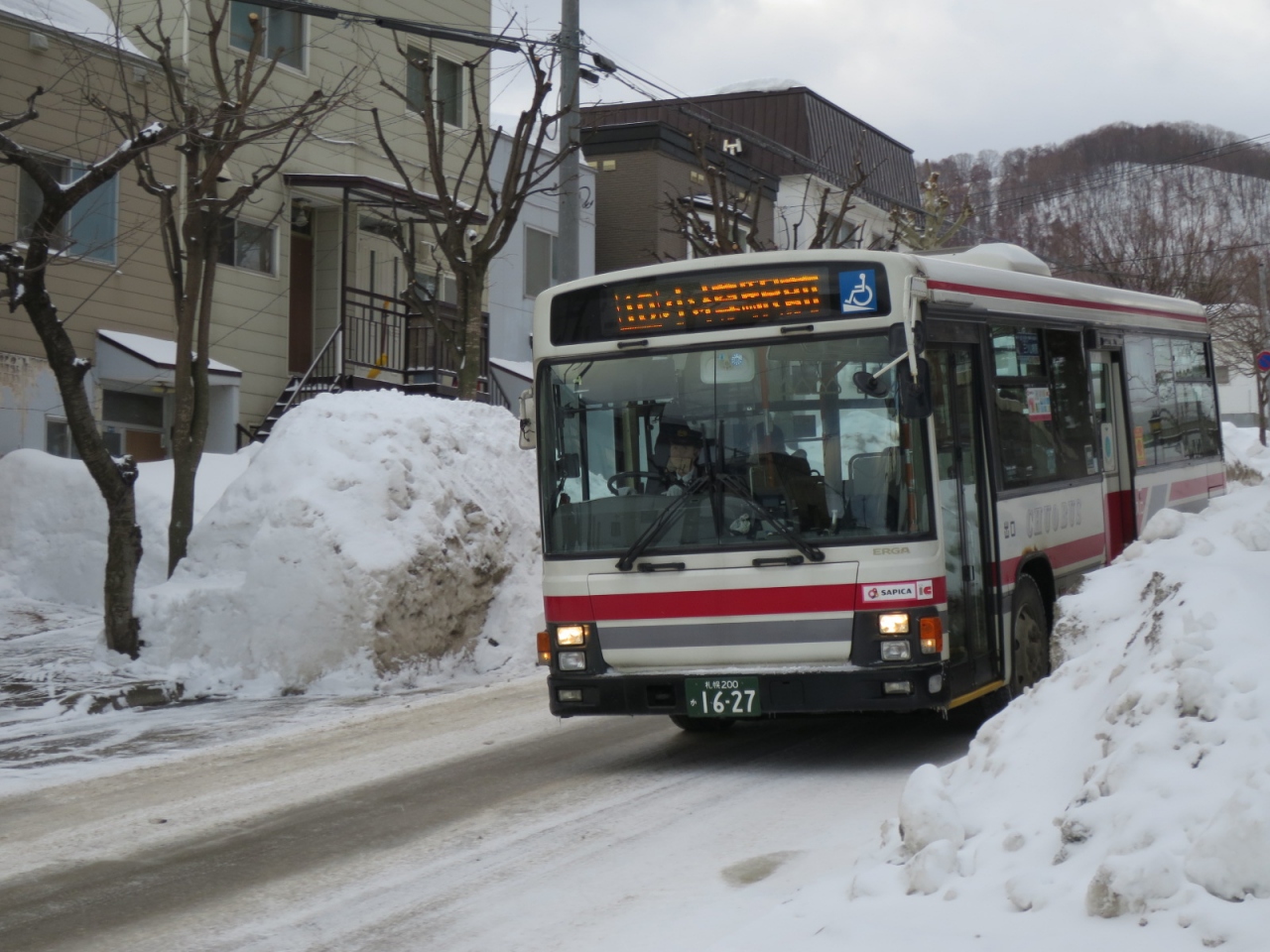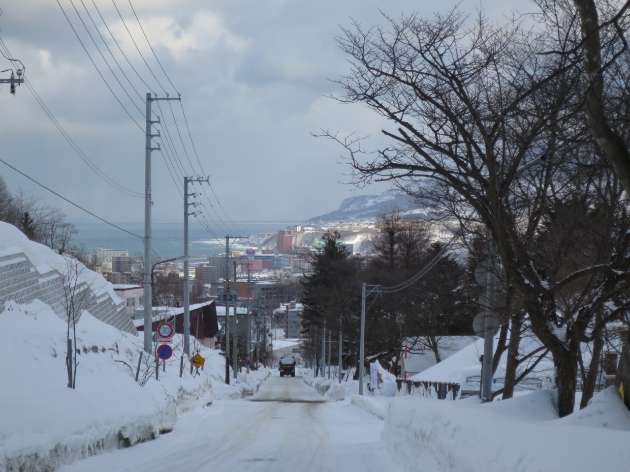 冬に訪れましたが、今では除雪がされ、交差点やバス停のあたりでは、車道まるごとロードヒーティングが効いている場所がありました。それでも路面がツルツルに凍る日は歩くのは大変そうです。バスが小樽駅から小樽商科大学まであります。平日・休日ともに30分に1本程度。朝の通学時(8時代)は約10分に1本です。