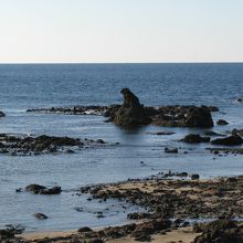 少し海岸からは離れている海の中に、高さ4mほど、西の空に向かって火を吐くように見えるゴジラの様な形をした岩があります。