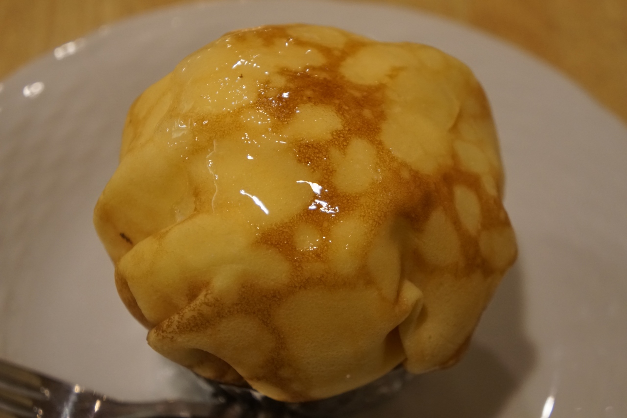 前田珈琲は、幕を張った店構えの喫茶店。京都ならではの奇抜な意匠です。普通にモーニングを食べようと入ったのですが、バルーンというお菓子が目に入って、急きょそれに変更。クレープで包んだ外観はまさに風船のよう。面白いですねえ。中にはフルーツケーキ。生クリームの味わいも抜群だし、朝からヘビーなスイーツをガツンといただいてしまいました。