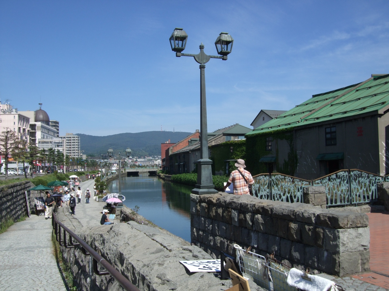 日中は、散策路に小樽運河を描く画家(?)やアクセサリー作家が作品を並べて販売をしています。夕暮れ時には、ガス灯がともり、石造倉庫群がライトアップされ、昼間とは違った雰囲気を演出しています。