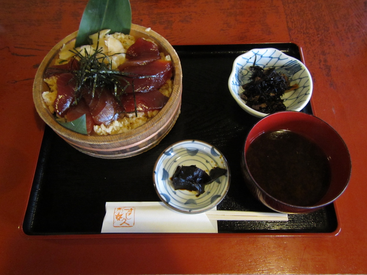 おはらい町のてこね寿司の有名店です。宇治橋の古材で建てられており、なかなか趣のある外観です。平日の昼時に行きましたが、式年遷宮の時期だったためか、非常に混んでいました。鰹の漬けと酢飯のバランスがよく、美味しく食べれました。一緒に出てくる赤出汁の味噌汁もよい味です。