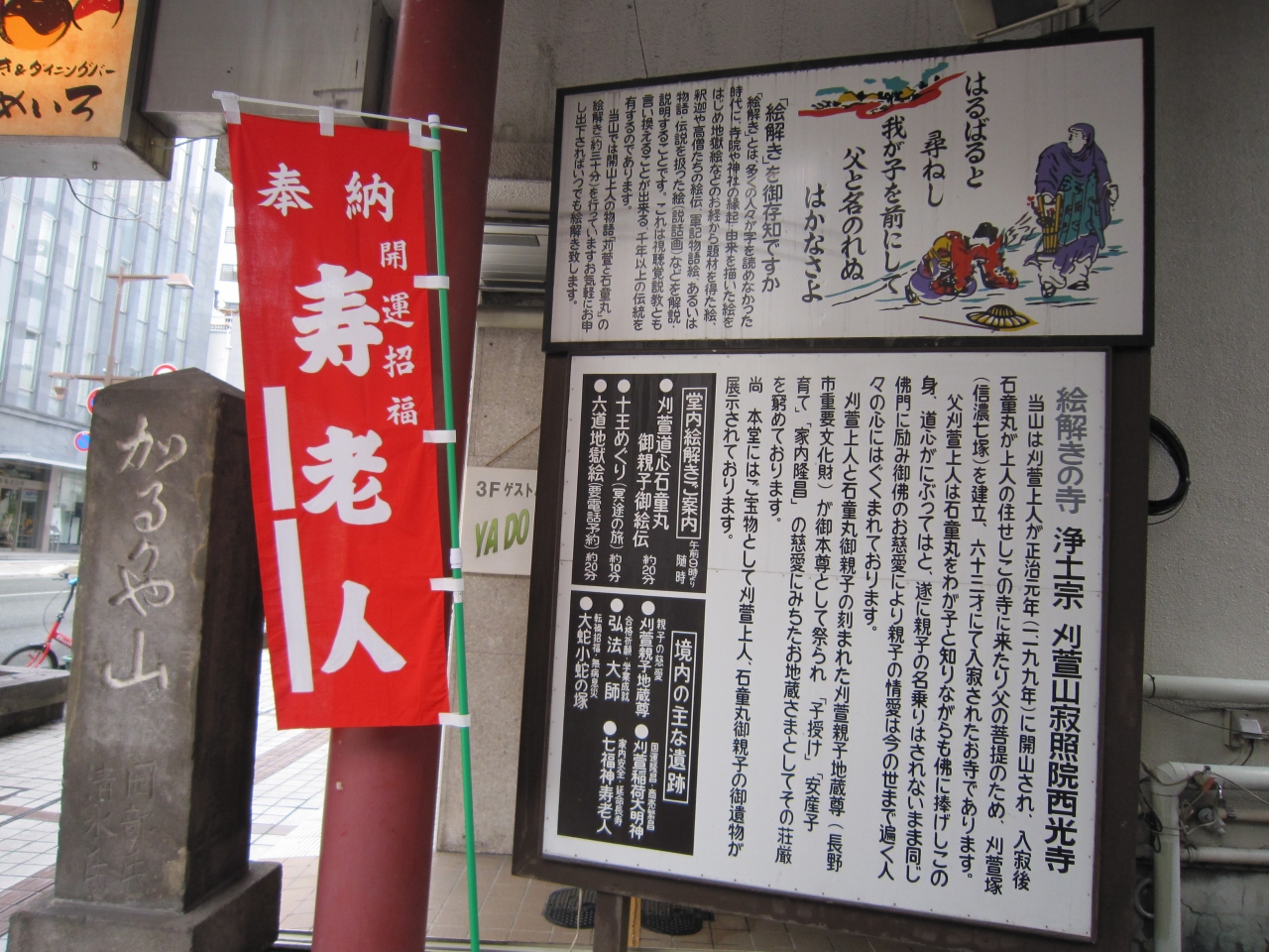 長野駅から歩いて約5分、苅萱上人と石童丸親子ゆかりのお寺。本堂に2人が刻んだ2体の地蔵尊が本尊として安置されており、寺の由来等を江戸時代の絵を使い物語性豊かに分かり易く説明する絵解きが有名です。境内には親子対面像、親子のお墓、大師堂、善光寺七福神寿老人像、回向柱残材柱(7年に一度、今年善光寺御開帳あります)他、碑、塚がいろいろあります。中心市街地にあります。絵解きは聞いた事がありません。一度は聞きたいと思います。善光寺に行く途中です。見るのも多いですので立ち寄ることを勧めます。