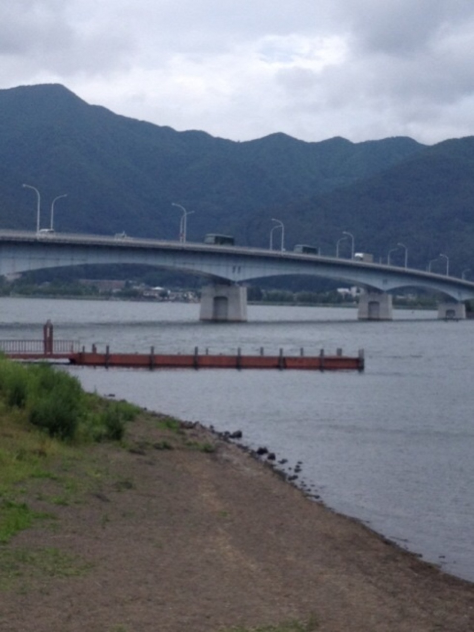 山梨県の河口湖東部の産屋ケ崎から南岸の梨宮公園にかけて南北に架かる橋です。山梨県企業局が1600mの有料道路として建設されていましたが、いつの間にか無料となっていました…