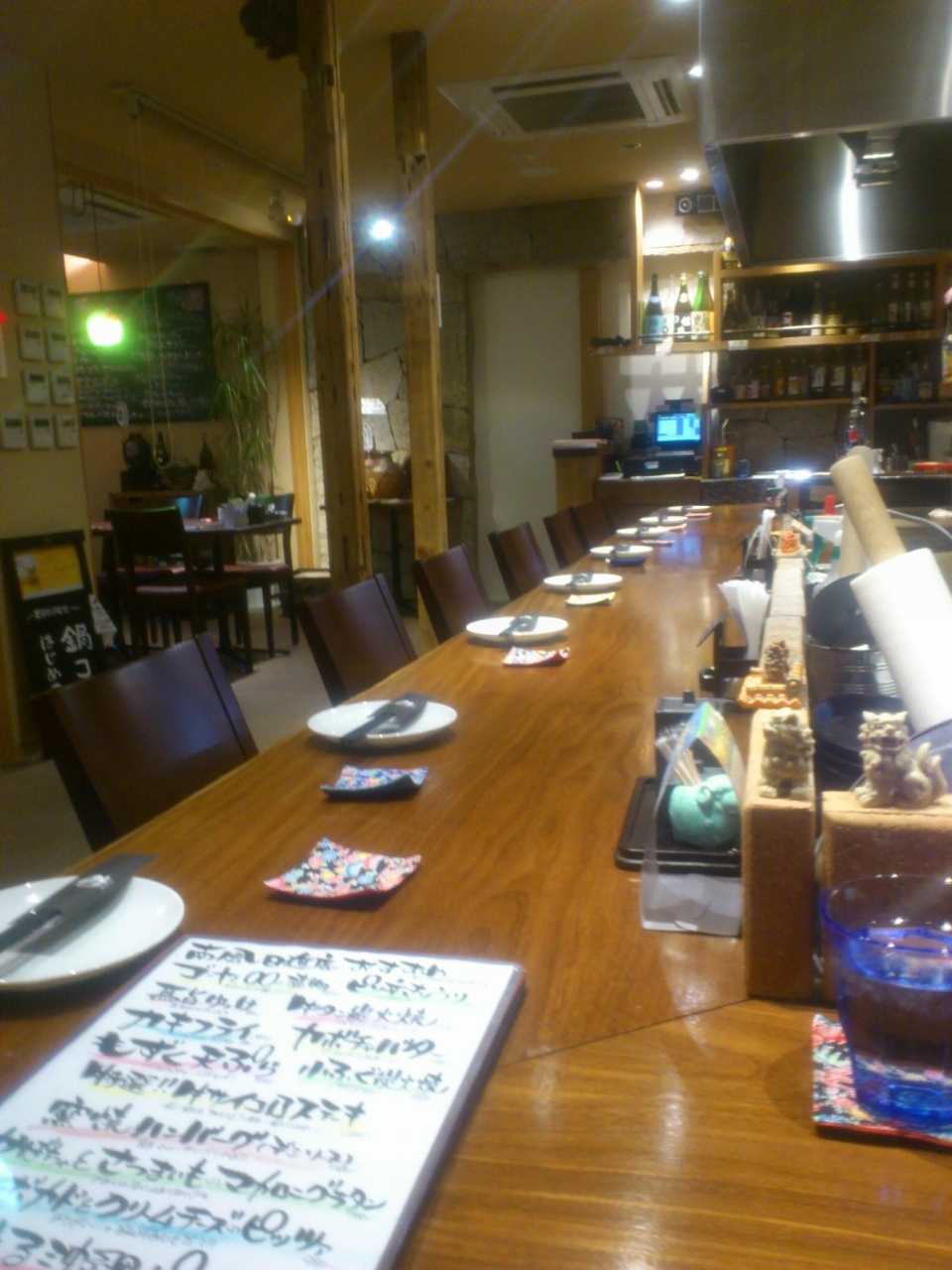 日進にある沖縄料理のお店です。店内はとてもおしゃれで、大きな鉄板のあるカウンター席やテーブル席もあります。また沖縄料理だけでなく、ピザ(ピザ釜がある本格派)や鉄板料理なども豊富です。沖縄そばと豚平焼きを注文しましたが、どちらも美味しかったです。