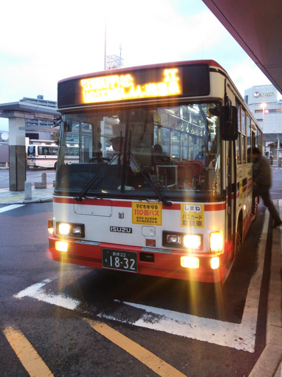 島根県のうち松江市内・出雲市内等で路線バスを運行しており、2015年1月末~2月初めの山陰旅行の際、松江城の北側に位置する武家屋敷に行くのに利用しました。