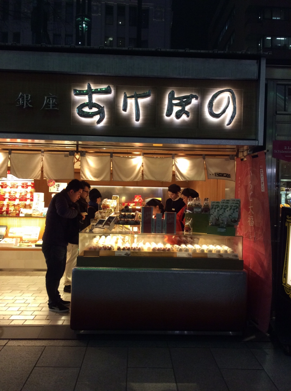 晴海通り沿いにあります。銀座四丁目交差点のすぐ近くでマネケンの隣です。昭和23年創業の老舗の和菓子屋さんです。今の時期は店頭のディスプレイに豆大福がずらっと並んでいます。白玉粉をつかっているのでなめらかな触感の美味しい大福です。