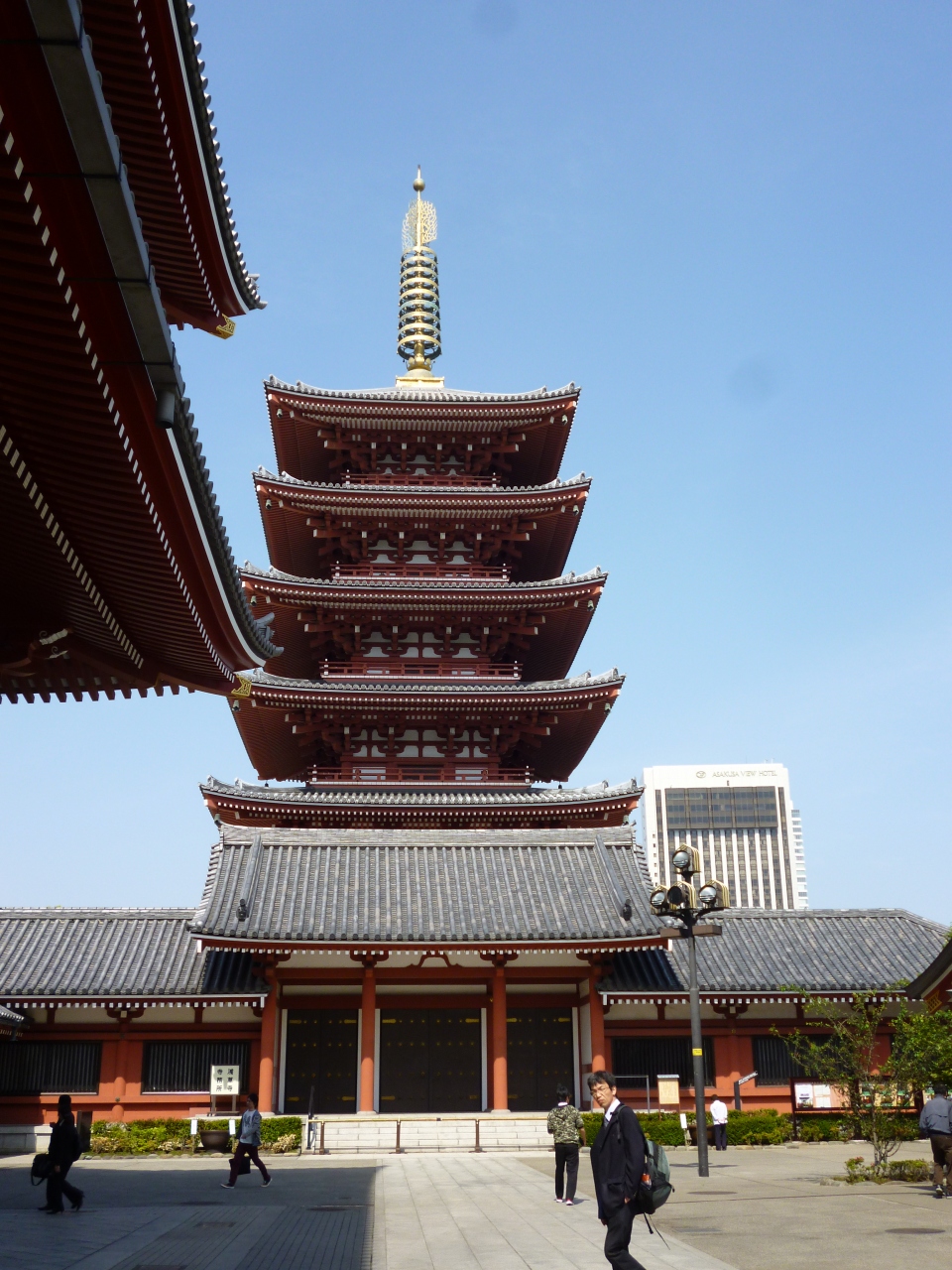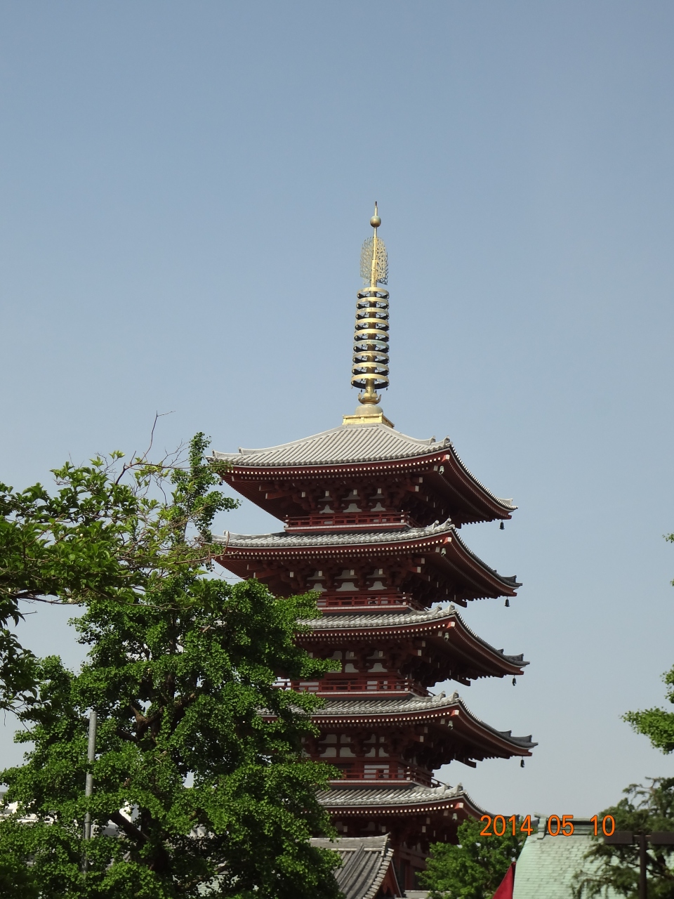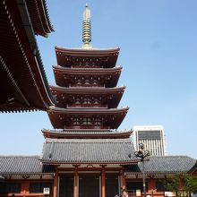 浅草寺の五重塔は天慶5年(942年)に建立されたのが最初で、その後、倒壊や火災に遭い、その都度再建されたそうだ。徳川3代将軍家光によって建立された五重塔は国宝であったが、大戦により昭和20年に他の伽藍とともに消失した。残念極まりない。その後、昭和48年に参道を挟んで反対側に現在の五重塔が再建された。仲見世通りから見ても少し奥まっていて、見た目にも新しい感じもするので、写真撮影する人もあまり多くないようだ。