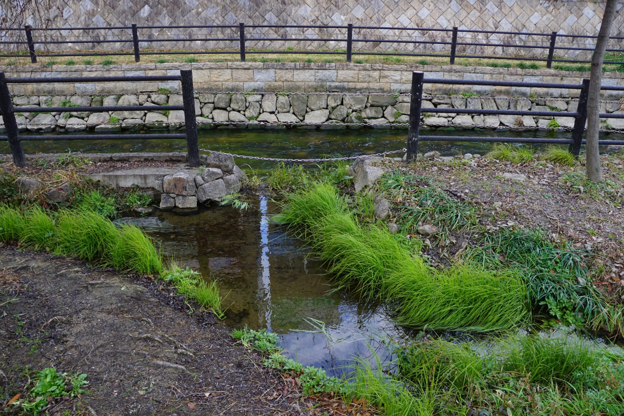 寝屋川せせらぎ公園は、寝屋川駅の西側すぐ。寝屋川沿いに整備された親水公園です。駅からベル大利商店街といった市街地にはこの寝屋川を越えて行くので、市民の皆さんはこの公園を毎日眺めているのかも。川は清掃も行き届いていて、川底の水草が見えてきれいでした。