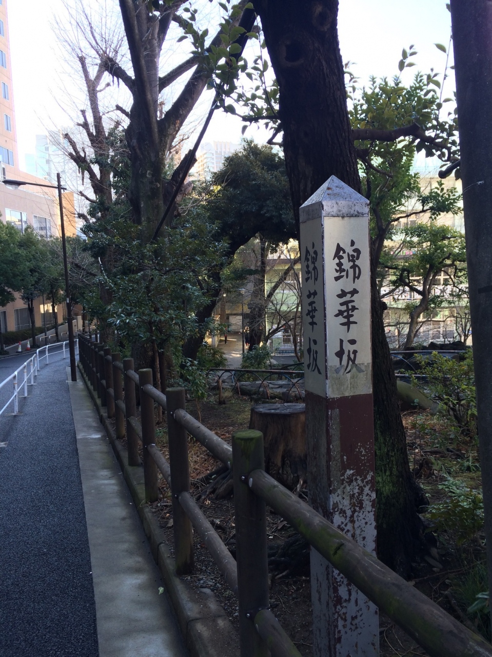 錦華坂は、錦華小学校(現在のお茶の水小学校)が坂下にあることなら名付けられたそうです。大正時代の区画整理ができた比較的新しい坂なんだとか。