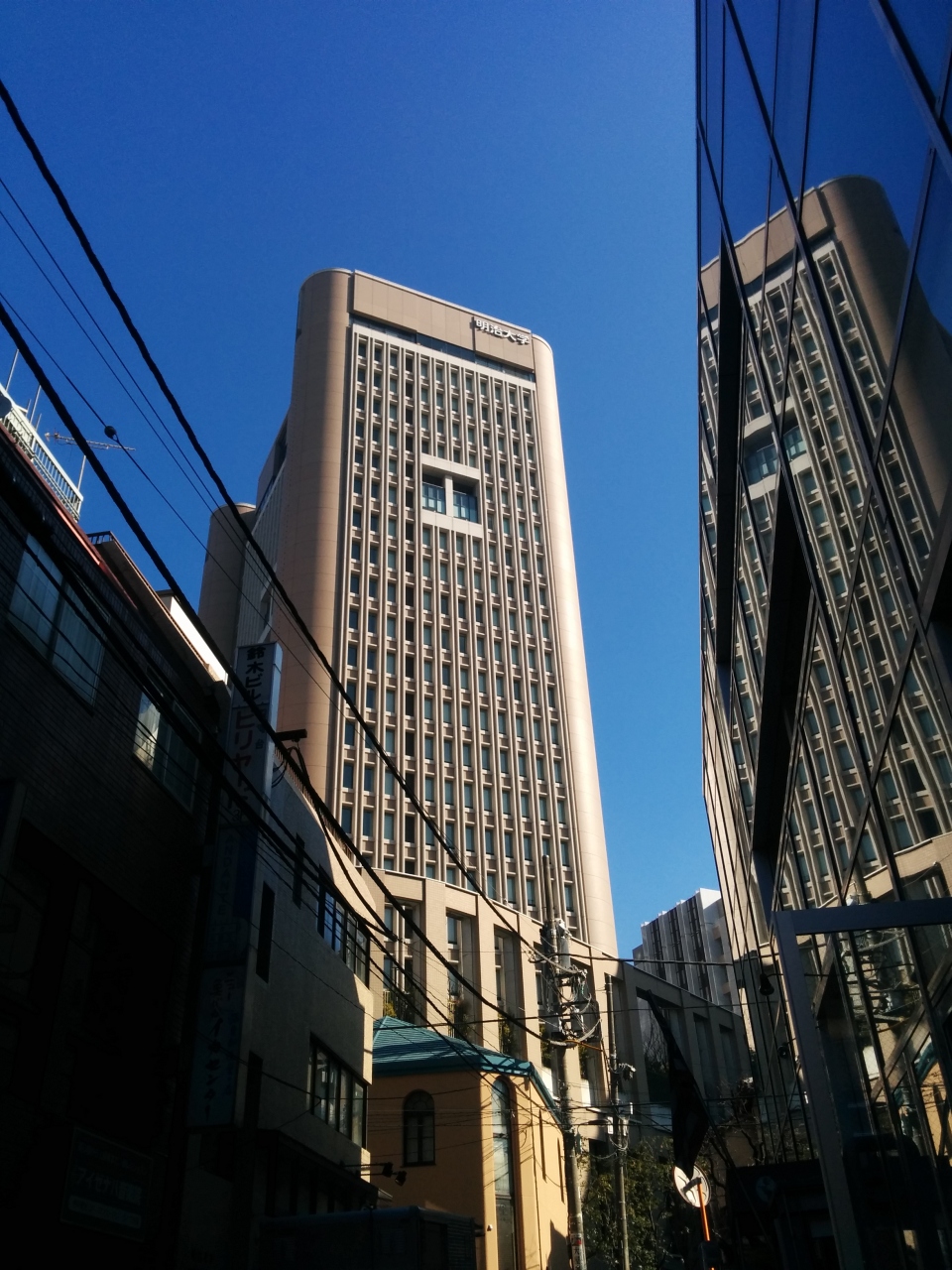 明治大学のキャンパスです。とてもきれいです。都心なので、縦に巨大です。階数は二桁かな?そのかわり、敷地はそんなに広くないです。この本館の上から2番目くらいの階に、学食があります。かなり眺めがよくて、すてきなランチタイムになります。