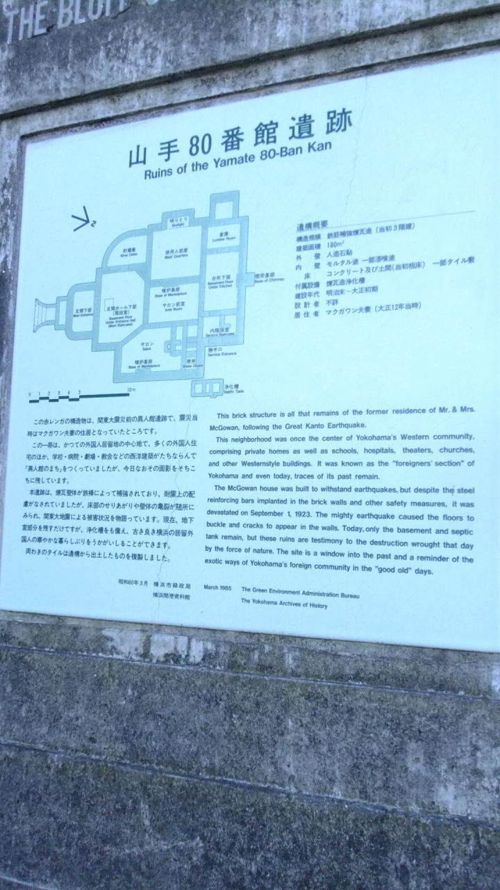 元町公園の階段を上っていくので少し遠いけれと、エリスマン邸近くにこの遺構があるのでそのついでに寄るのなら、アクセスはいいのだと思う。柱のあとや壁の跡などが残っていて赤いレンガの様子がわかる。そばには詳しい説明の板もあって、なるほどと思った。
