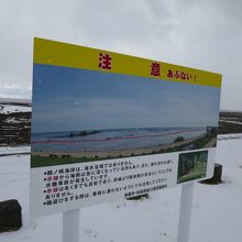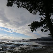 日本の渚100選の遠浅の海。潮が引くと100~200m先まで磯が現れます。幅に多少の差がありますが、長さは、女川のあたりから台島のあたりまで2km近く続いていました。磯遊びにうってつけですが、海水浴場にはなっていません。海水浴場ではないことと、写真付きで海岸の深くなる場所を知らせる看板が立っていました。