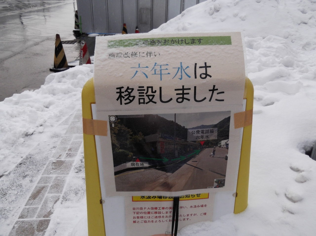 関越トンネルの手前、下りの谷川岳PAです。駐車場に侵入してみると、トンネルの展示館みたいなものが合った場所がフェンスで覆われていました。と言うことは 隣接していた湧水場所は何処に行ったのかと思い、近寄って見ると移設の案内が・・・施設の反対側の壁面に蛇口が並んでいました。いくら「6年水」でも、気分が違うのは気のせいでしょうか?上りの湧水場所は変わっていませんでした。(写真なし)何時もの駐車位置が空いているとホッとします。