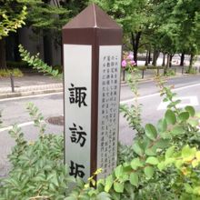 北白川宮御門前より赤坂門の方へ下る坂で、もと諏訪氏の邸宅があったことから名付けられたようです。また、別名は達磨坂ともいわれていますが、旧宮邸が紀州藩であり、その表門の柱にダルマに似た木目があったため達磨門とよばれていたようです。現在は諏訪宅もダルマもありません…