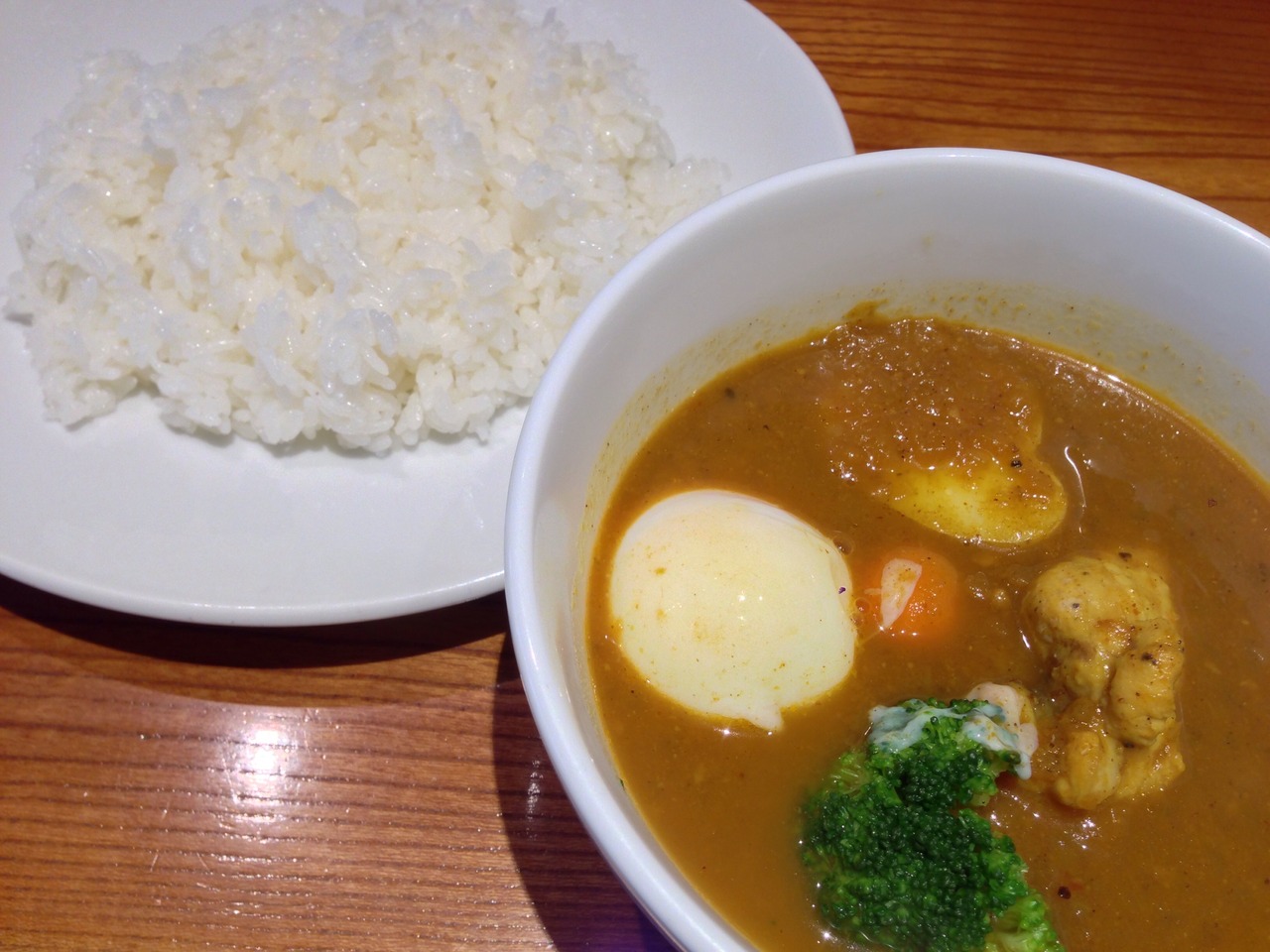 チキンのスープカレーはルーに細かな玉ねぎがたっぷり入っていて程良くスパイシーで、骨付手羽元と大きめの野菜が食べ応えがありました。