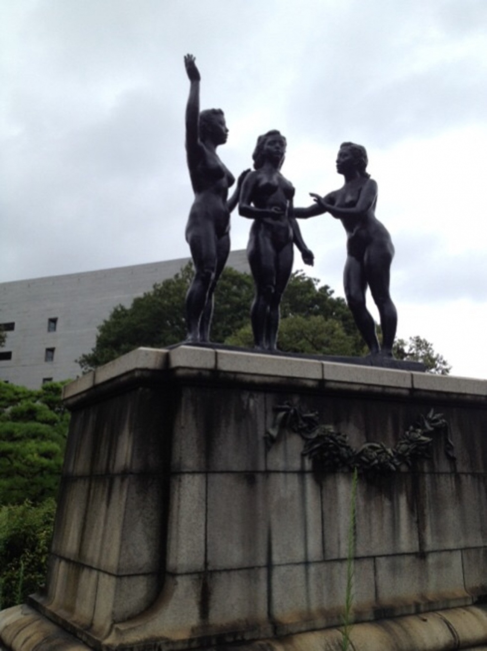 中央に三人の女性像がある公園ですが、これは愛情、理知、意欲を象徴する3女性の裸像で、平和の群像と名付けられています。
