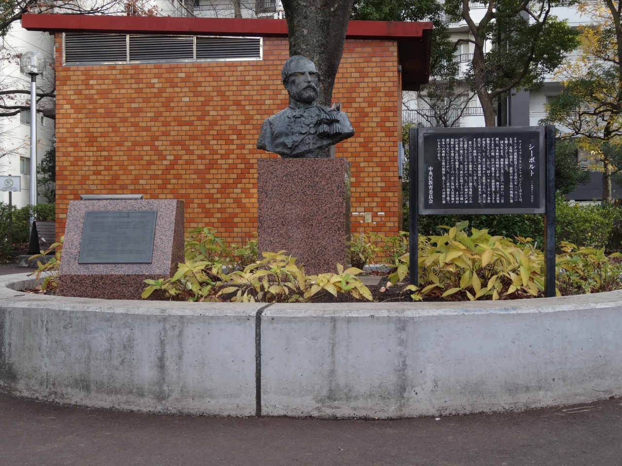 築地のオアシス的存在であるあかつき公園内にあります。江戸蘭学発展に寄与したということで、ここに彼の功績に報いるべき建てられたとのこと。公園内にひっそりと建てられているという感じですので、探さないと通り過ぎてしまうかもしれません。