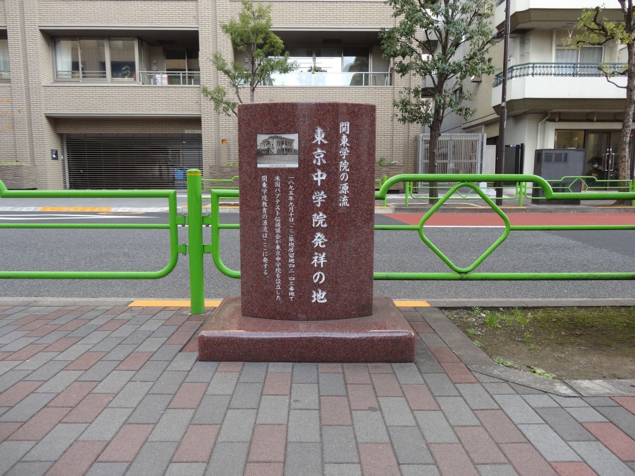 現在は横浜市金沢区に位置する関東学院大学。こちらのルーツのひとつであるのが、1895年に設立された築地の東京中学院です。この付近は学校発祥の地が多いですが、神奈川のイメージの強い関東学院もここが発祥の地のひとつは新鮮な発見がありますね。
