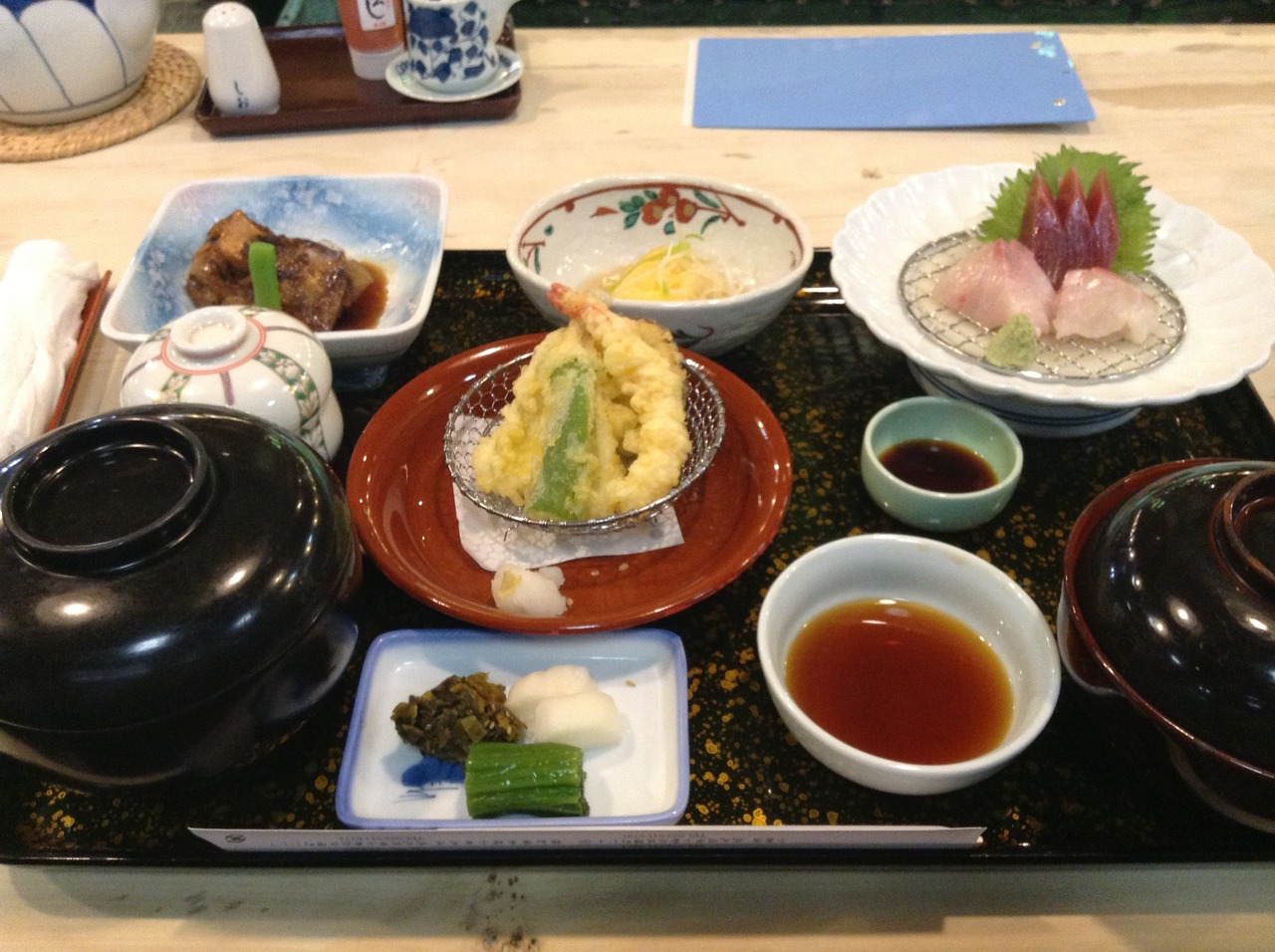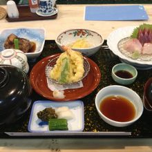 和定食はマグロ、カンパチ、鯛の刺身、かぶと煮、天婦羅、茶碗蒸し、蟹味噌汁で、チューブ明太子が使い放題でした。