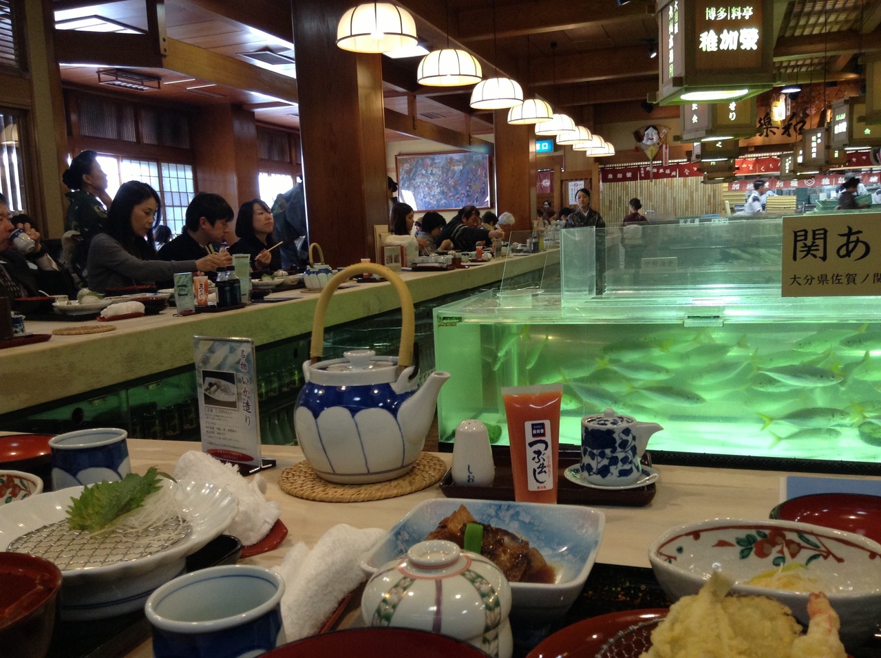 年末のランチに訪問しましたが、入口から行列ができていました。待つこと10分で生簀を囲んで大きなカウンターがあり、そこをぐるっと囲んで50から60人程度が座れるようになっています。