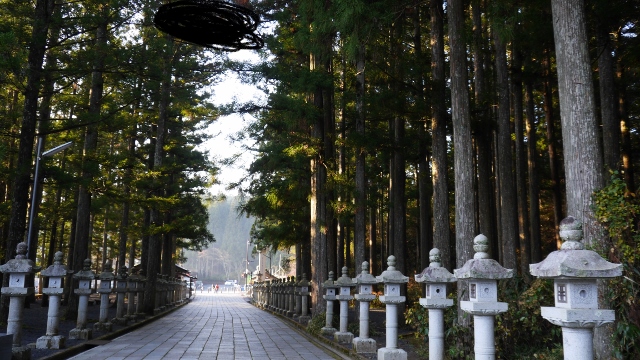 南海ケーブルの高野山駅から路線バスに乗り一番最初に訪れた高野山の参詣ポイント。一の橋から弘法大師御廟まで参詣道がとおっており片道約20分程度。樹齢何年かと感じさせられる太い杉の木々の中、無数の墓石が並んでおり異空間の雰囲気を感じさせる場所だった。