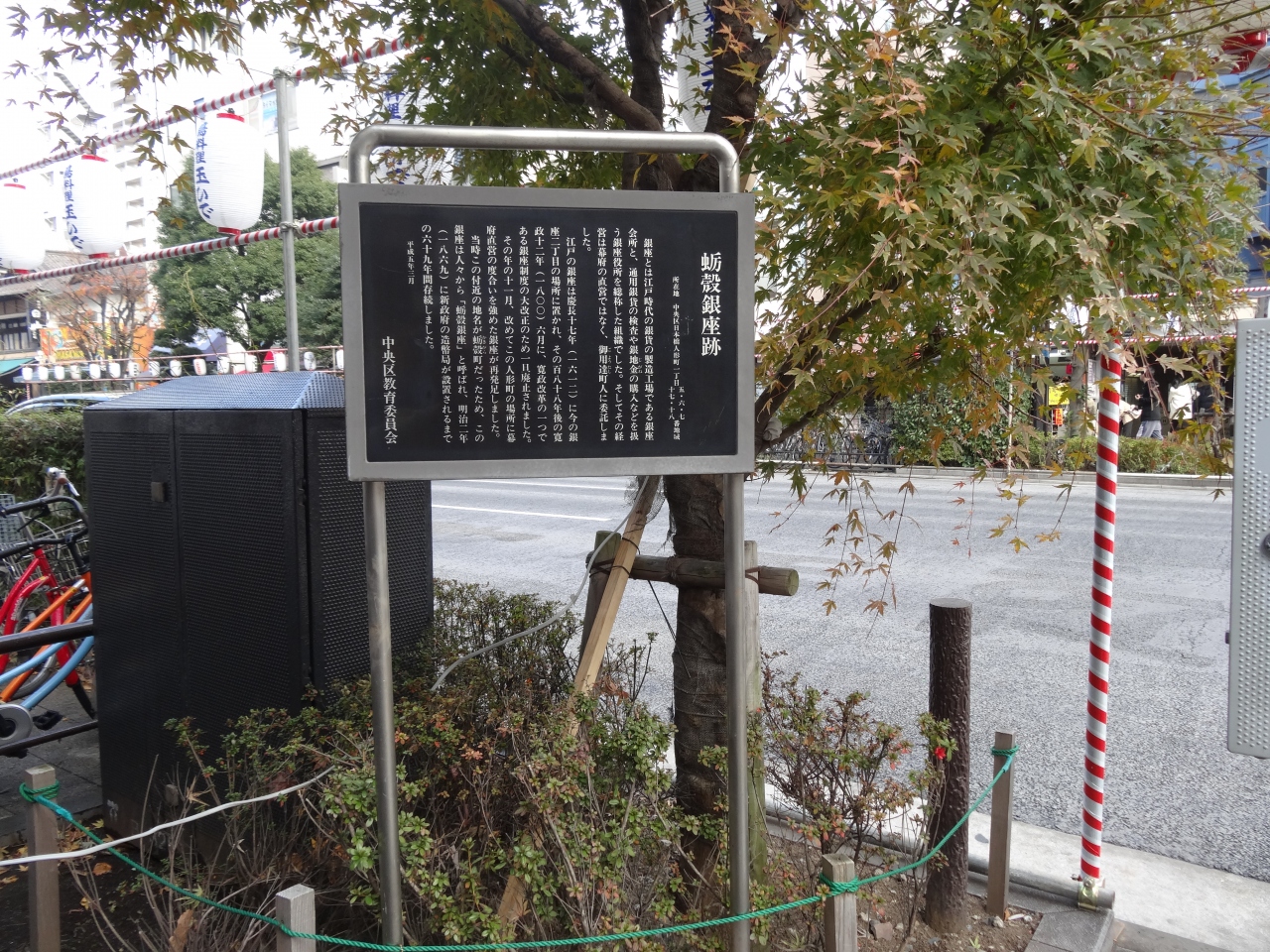 人形町駅からも水天宮前駅からのすぐの場所にあります。1801年に、銀座2丁目から、この地・日本橋蛎殻町に銀座が移転し、明治2年に造幣局が新設されるまでの68年間、銀貨鋳造が行われた場所です。今では、看板がひっそりと建つのみです。