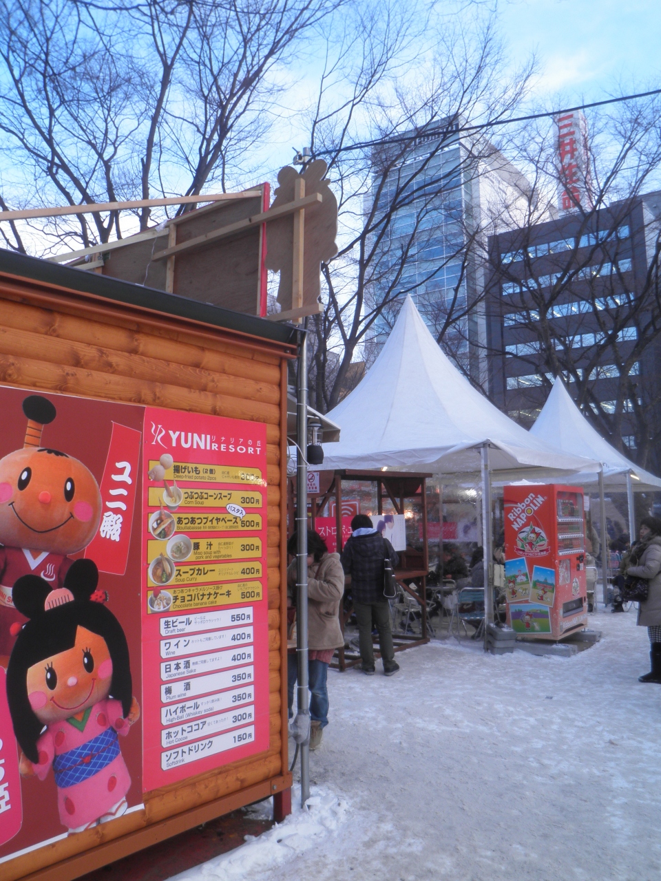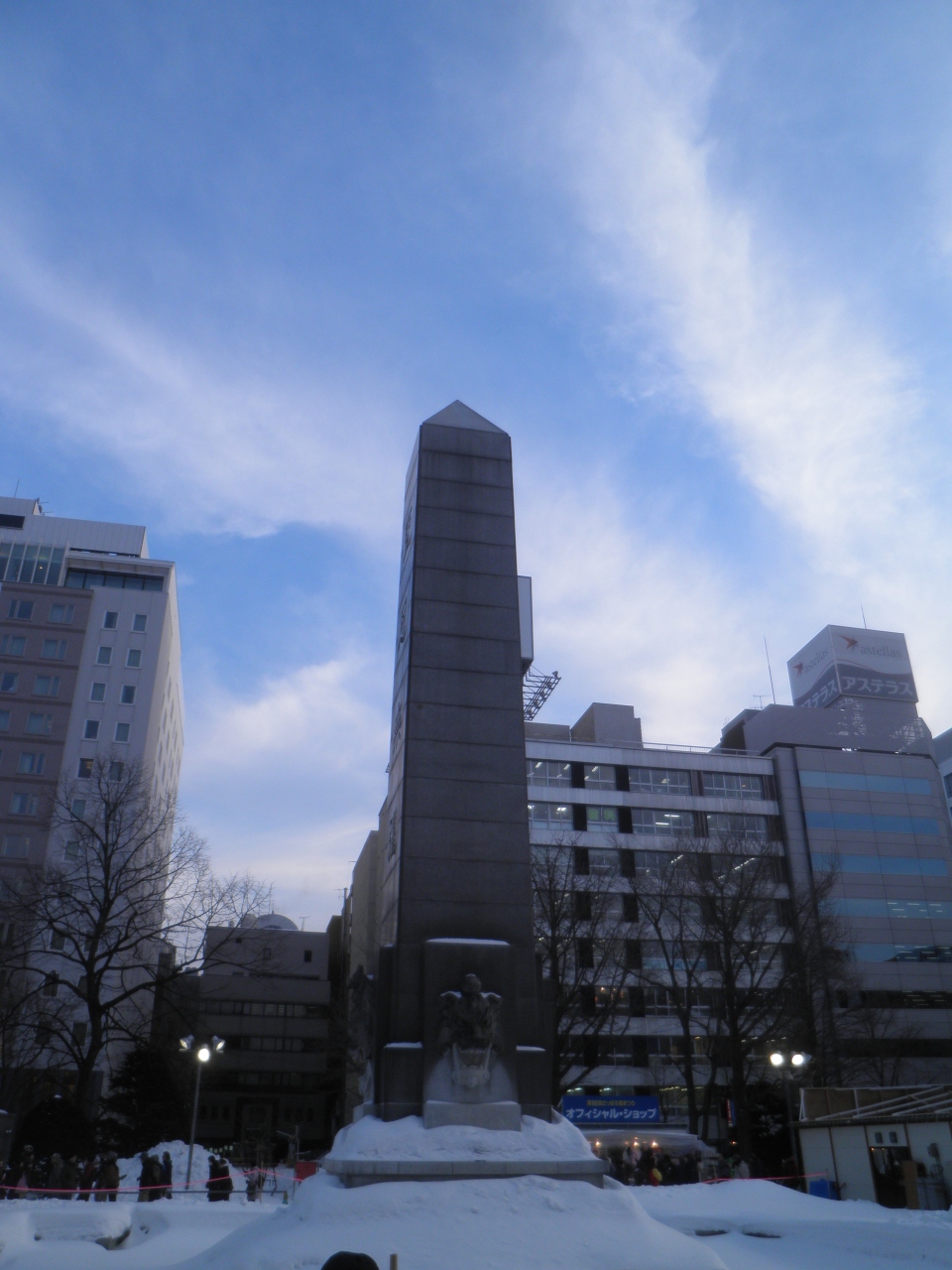 札幌の大通り公園は、さっぽろ雪まつり2015の会場のひとつになっています。 初日の午後、お祭りに行って、大通り公園をひととおり巡ってみました。 聖恩碑は公園の真ん中に立つ、大きな石の塔で、噴水は止められて周囲は雪が積もっていました。 食べ物関係の出店が多く並んでいました。