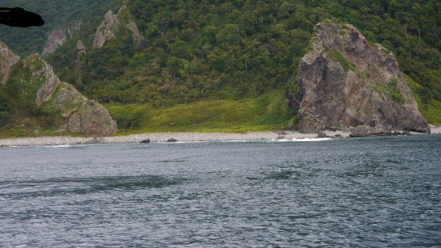 ルシャ湾は世界遺産知床半島に位置する海岸。道路がないので観光客は陸路からアクセスすることはできない。ウトロ港から知床観光船が出ており、ヒグマの出現率が高い場所として海上から眺めるポイントとなっている。訪問時もヒグマ2頭を発見、遠くからなので黒い点のようにしか見えなかったが。