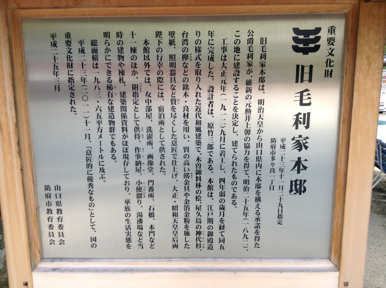 旧毛利邸は、防府市の防府天満宮から車で、3~5分程の所にある大正に建てられた毛利公爵家の御屋敷を一般公開しているものです。