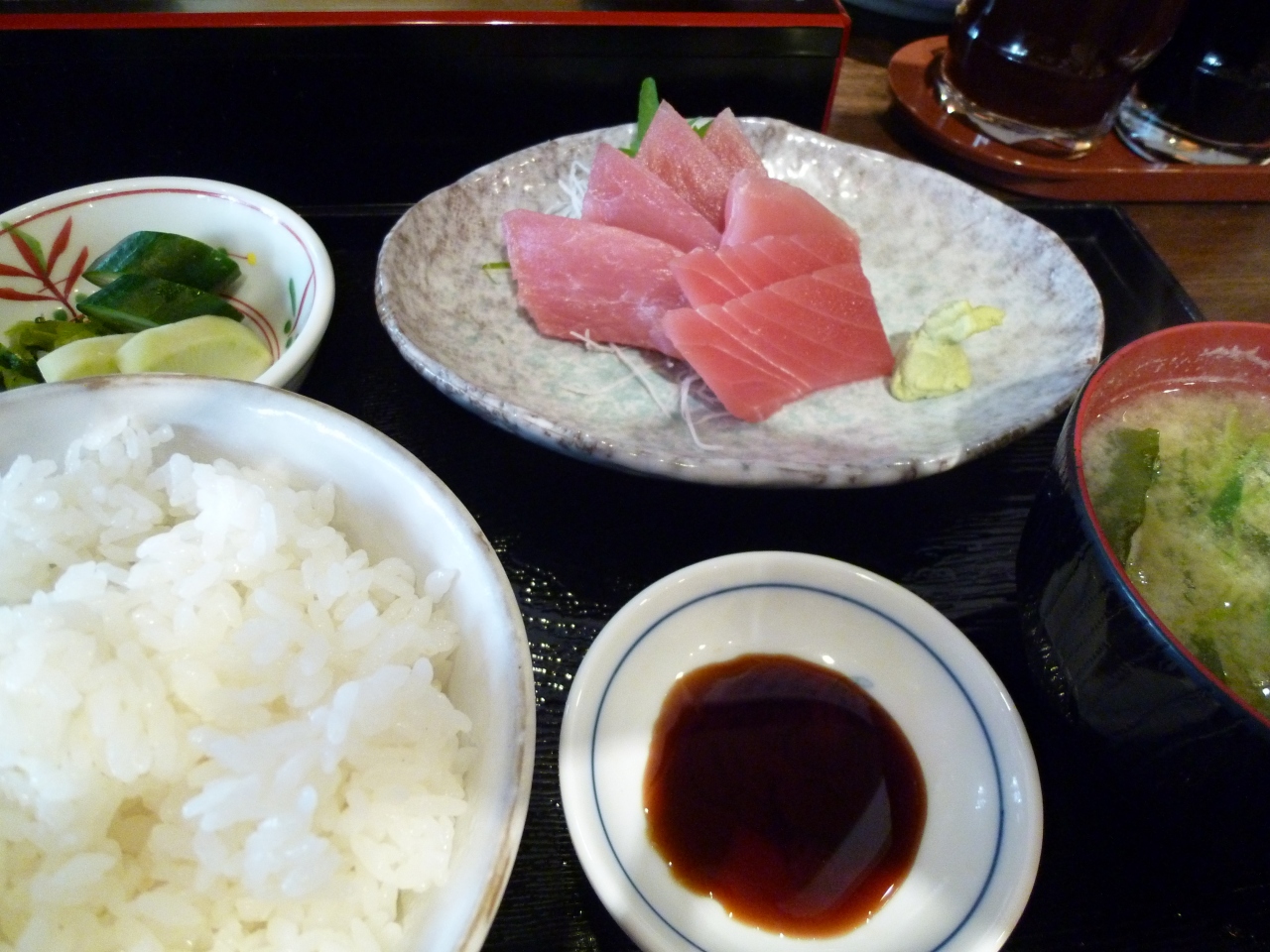 メニューは豊富で迷ってしまう。おススメから選んだのは、ミックスフライ定食とマグロの刺身定食、ミニポテトサラダをプラスしました。