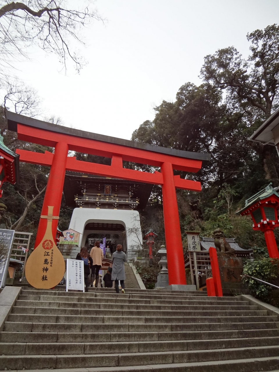 江の島を訪れた人のほとんどが足を運ぶ場所ではないでしょうか。「海に突き出た小さな島にある神社」というロケーションは、旅心をくすぐられます。アップダウンがあり、やや体力を要しますが、エスカー(エスカレーター)に乗らず、出来れば階段を登って参拝したいところです。