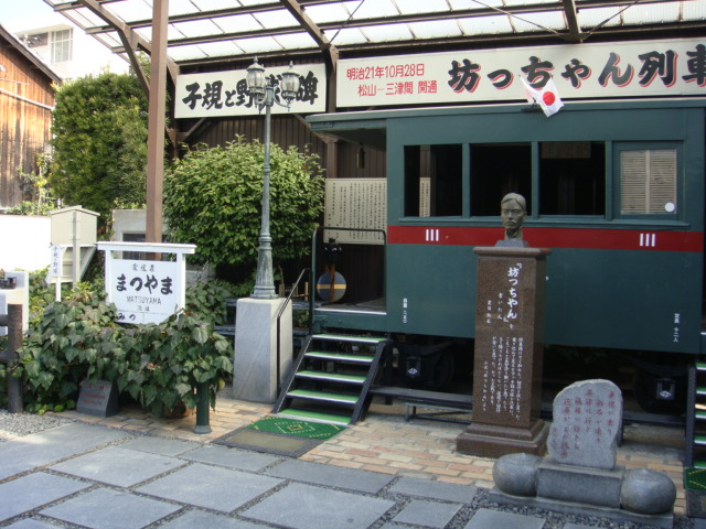 松山市駅から徒歩5分程度、正岡子規が17歳まで過ごした場所です。境内へ入ると正面に正宗寺、左側に坊ちゃん列車と子規堂があります。子規堂は木造平屋建ての小さな建物で、中には子規や漱石に関する資料が展示されており、入口付近には銅像もあります。入場料は大人1人50円ですが、外から坊ちゃん列車や子規堂を見るだけなら無料です。