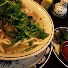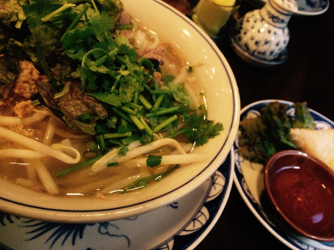 近代レトロビル芝川ビルの地下にあるオシャレなベトナム料理店です。店内は広くおてもオシャレ。ランチ利用で今回はフォーランチに。揚げ春巻きがついてきました。両方おいしい。空間が素敵なのでついつい長居しちゃいます。