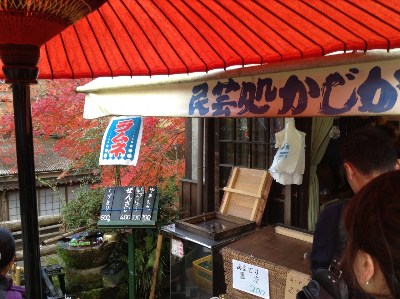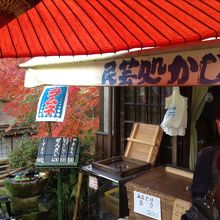 普通の白餅とよもぎ餅かあります。紅葉の激混みの時期だったので、焼きもち行列がありました。
