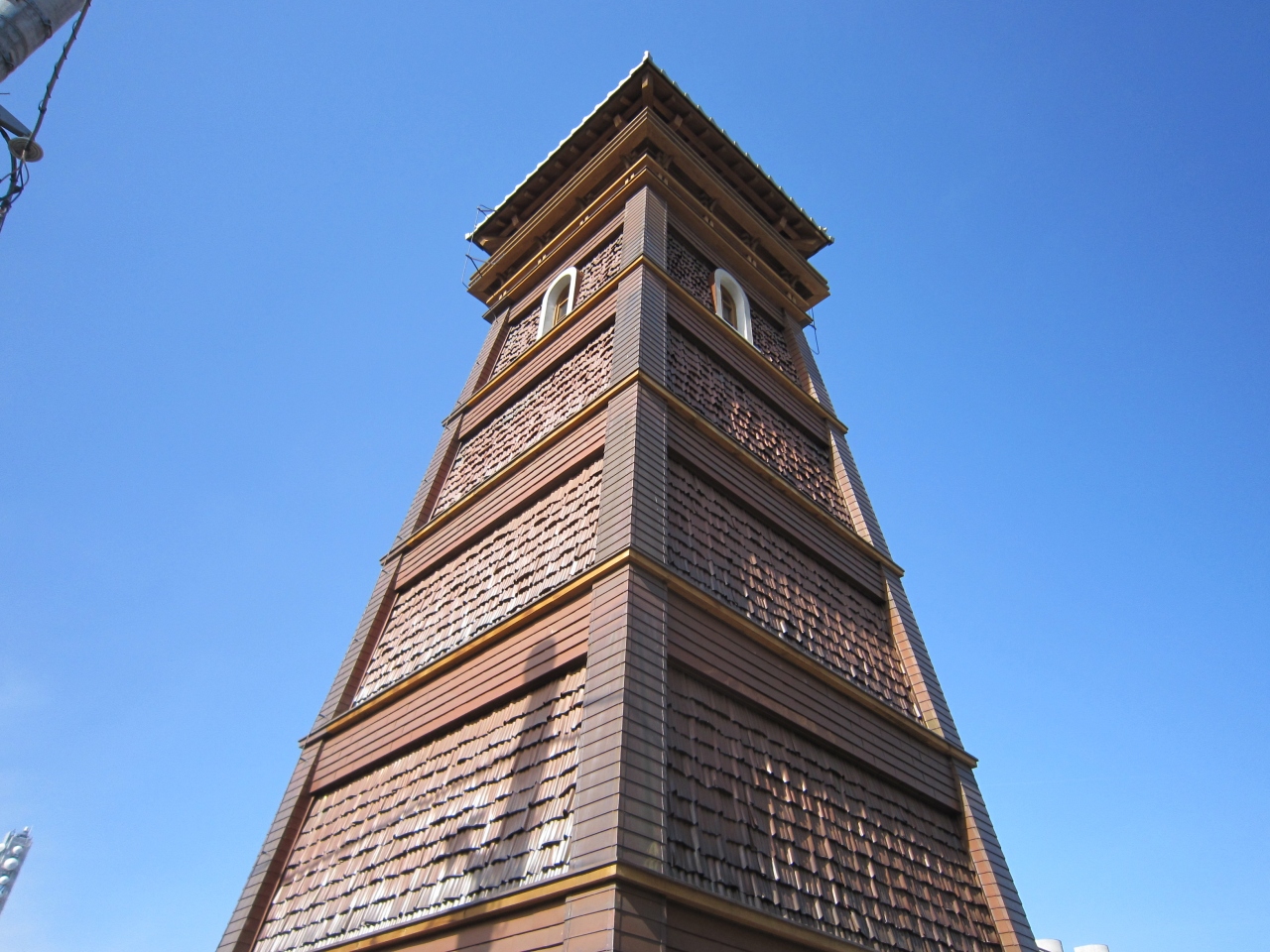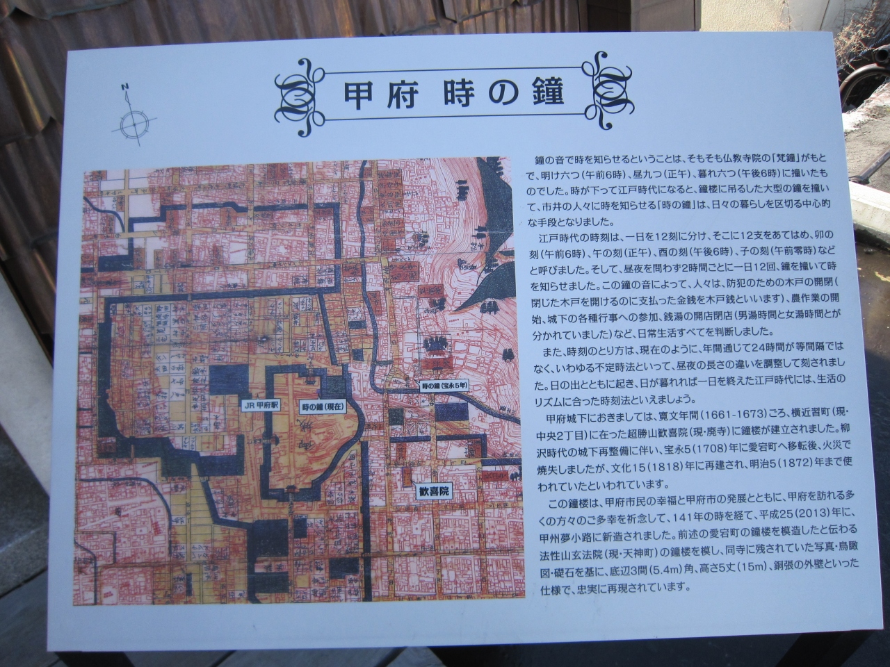 200年以上住民に時刻を知らせ明治時代初期に取り壊された鐘が甲州夢小路の一角に復元されたそうです。高さ15mで遠くからも見えます。時々鐘の音がするので近く行きましたら。横側にボタンを押すと約20秒後に鳴りますとありましたので押したところ鳴りました。良く響く音でした。